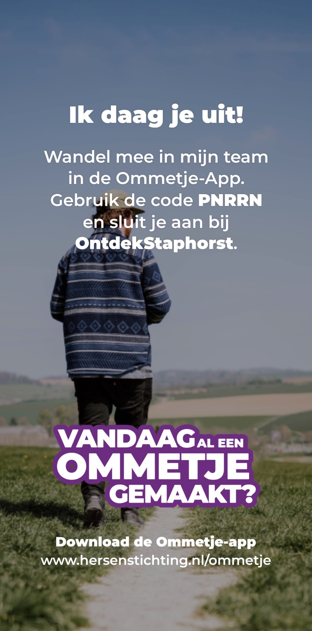 Meer dan de helft van de Nederlanders beweegt niet genoeg, terwijl dit heel belangrijk is voor gezonde hersenen. Daarom heeft de Hersenstichting de Ommetje- app ontwikkeld. Deze app helpt jou van wandelen een gewoonte te maken. In de app kun je persoonlijke weekdoelen opstellen, passend bij jouw instapniveau. Nodig vrienden of kennissen uit om elkaar te volgen in de samen- om functie. Krijg inzicht in hoeveel anderen wandelen en plan een moment om samen te gaan wandelen. Ook kun je een teamdoel instellen, deze voortgang kun je volgen en elkaar op een leuke manier volgen en motiveren met berichtjes. Wist je dat? 30% van de ommetje gebruikers van wandelen een gewoonte heeft gemaakt, door het gebruik van deze app?