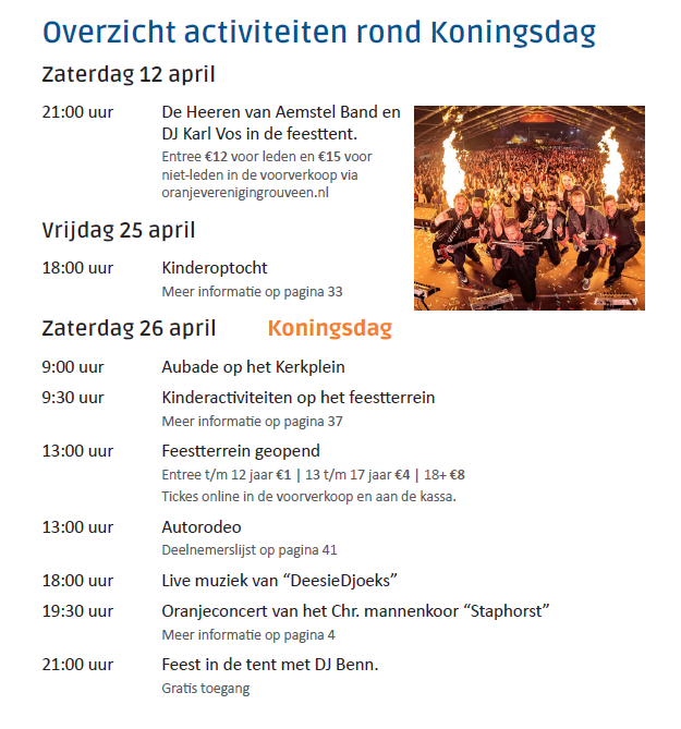 Om te beginnen wensen wij Koning Willem-Alexander op 27 april een fijne 58e verjaardag toe en hopen wij dat hij in goede gezondheid, samen met zijn gezin deze dag mag vieren. We hopen er in 2025 weer een feest te gaan organiseren zoals we gewend waren in Rouveen.