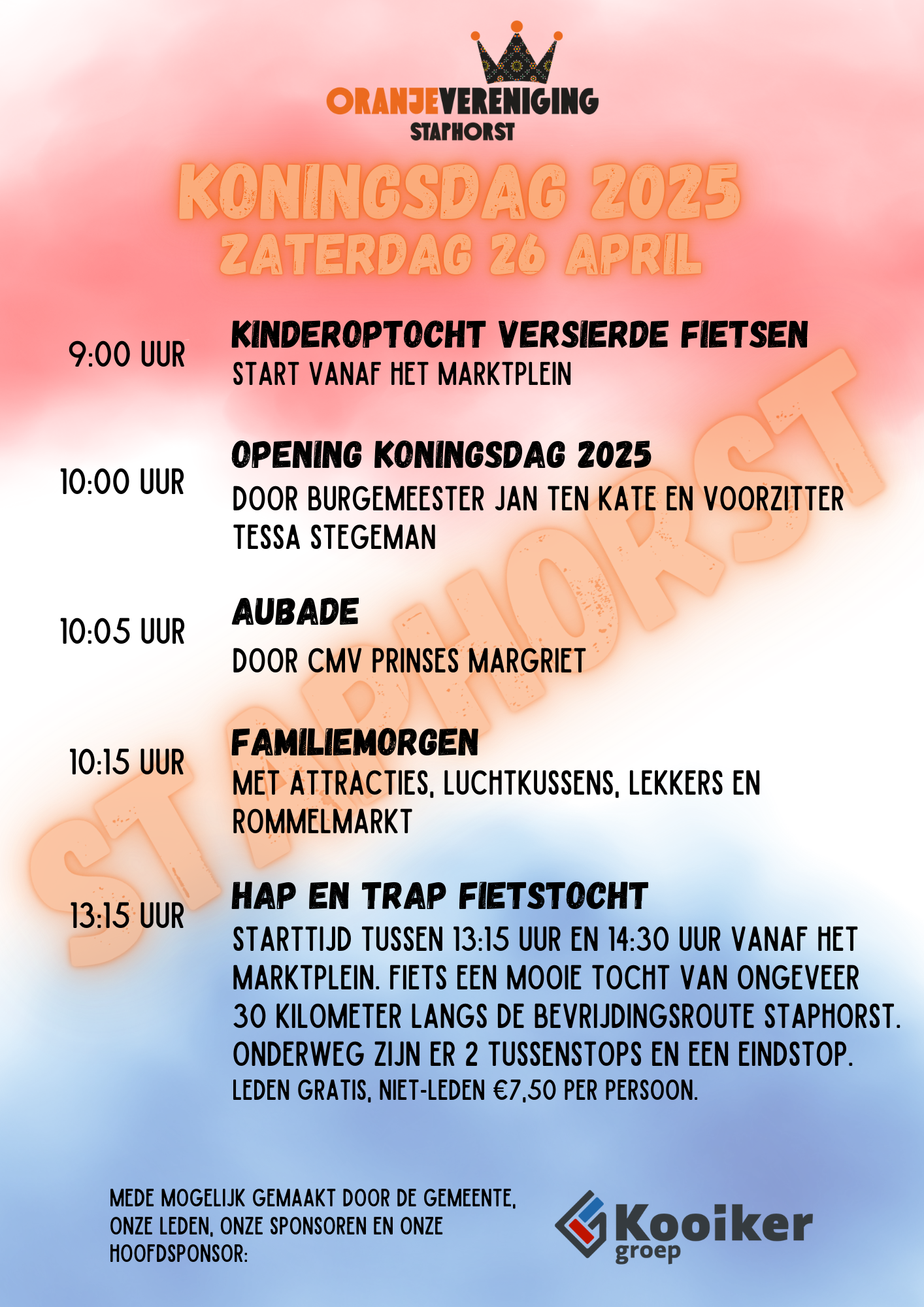Koningsdag in Staphorst belooft ook in 2025 weer een dag vol gezelligheid, kleur en traditie te worden. Van versierde fietsen en een feestelijke aubade tot een bruisende familiemorgen en de sfeervolle ‘Hap en Trap’ fietstocht langs de Bevrijdingsroute – er is voor jong en oud van alles te beleven. Op zaterdag 26 april verandert het Marktplein in het kloppend hart van de festiviteiten. Trek je oranje outfit aan en vier mee met het hele dorp!