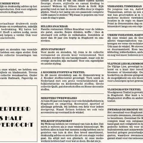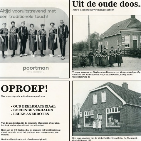 Deze krant is niet het enige 'papier' wat u in het jubileumjaar van ons ontvangt. Later presenteren wij een jubileumboek waarin Staphorst en de inwoners centraal staan. Wie in Staphorst of Rouveen winkelt, spaart volgend jaar voor prachtige plaatjes die in het boek kunnen worden geplakt. Dat levert vast een mooi aandenken op aan ons jubileumjaar.
