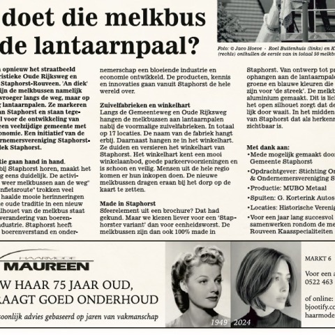 Melkussen sieren opnieuw het straatbeeld langs de karakteristieke Oude Rijksweg en Gemeenteweg in Staphorst-Rouveen. ‘An diek’ of in ‘de Streek’ zijn de melkbussen namelijk terug. Niet zoals vroeger langs de weg, maar op hoogte aan vijftig lantaarnpalen. Ze markeren het winkelhart van Staphorst en staan tegelijkertijd symbool voor de ontwikkeling van ‘boerendorp’ tot een veelzijdige gemeente met een bloeiende economie.
