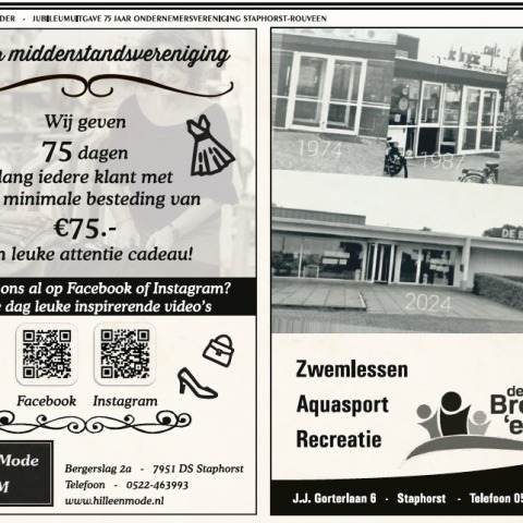 Deze krant ligt niet zonder reden op uw deur-mat. Ondernemersvereniging Staphorst-Rouveen bestaat namelijk 75 jaar. Met deze uitgave trappen we ons jubileumjaar af. Daarin willen we onze trouwe klanten op verschillende manieren gaan bedanken. Deze krant is het begin van diverse acties die gaan komen.