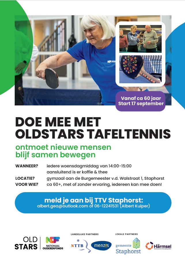 Tafeltennisvereniging Staphorst start op woensdag 17 september met een nieuw initiatief: OldStars tafeltennis. Dit is speciaal bedoeld voor mensen van 60 jaar en ouder die op een verantwoorde manier in beweging willen blijven, ongeacht leeftijd of ervaring. Iedereen is welkom!